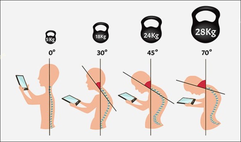 정상적인 상태에서의 머리 하중은 4~5kg으로 목에 큰 부담이 없지만, 거북목 자세에서는 머리 하중에 3~3배 증가하게 되고 등이 굽어집니다.